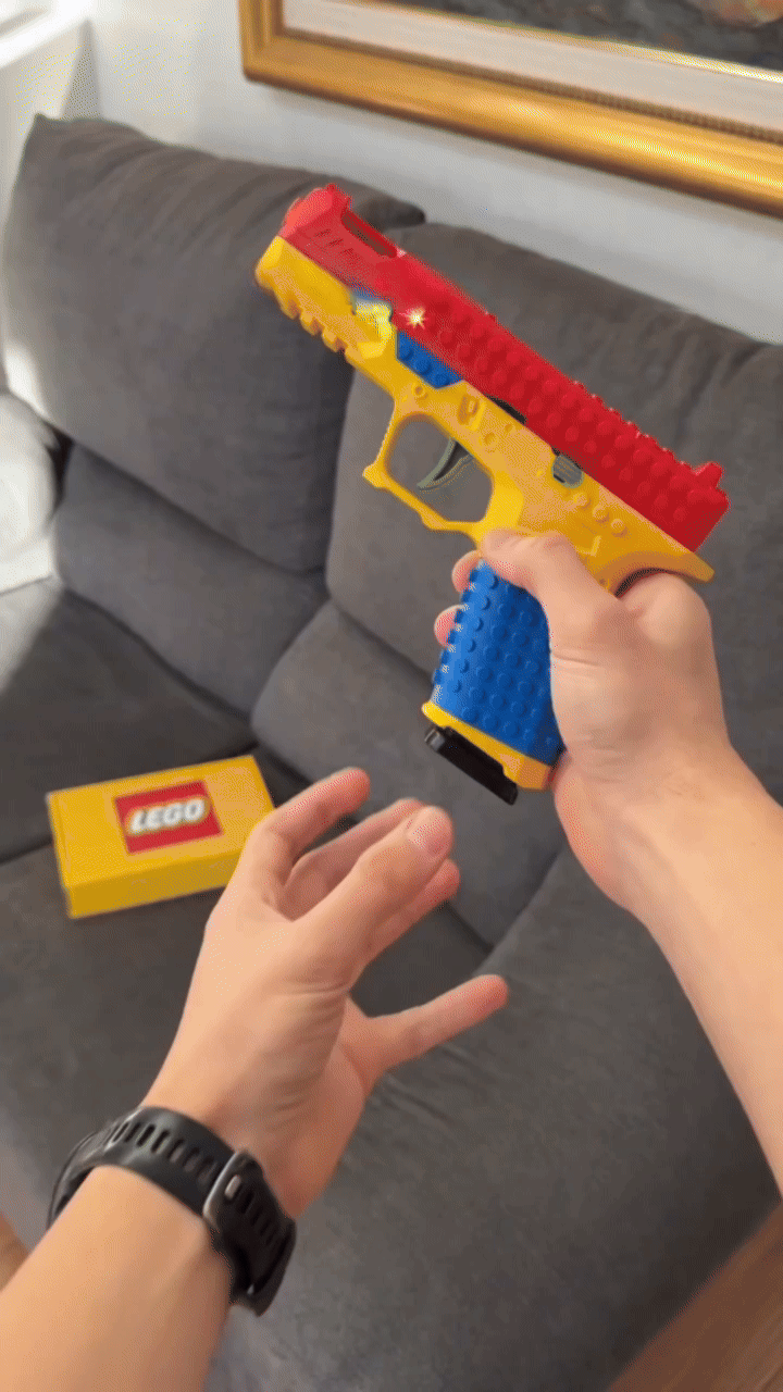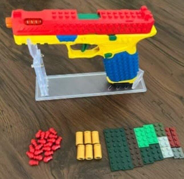 Vous pouvez ajouter vos propres décorations en blocs sur les surfaces texturées. Le pistolet lui-même n'est pas un jeu de construction, mais sa conception à tenons vous permet d'y fixer des briques compatibles pour une personnalisation encore plus poussée.